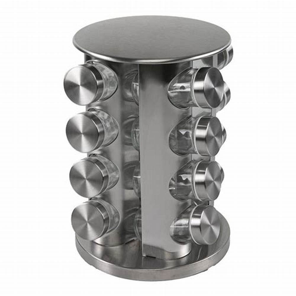 Especiero de acero inoxidable con 16 frascos de vidrio con tapa agujereada de plástico y otra a rosca en acero inoxidable