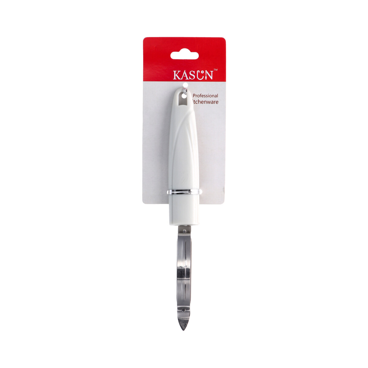 Pela papas reforzado de alta calidad. Acero inoxidable y mango de plástico blanco. Linea Kascun.